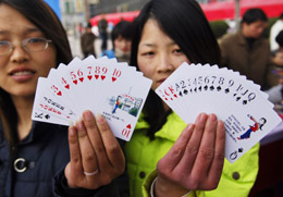 3月6日,兩名女青年在展示“外出務工婦女安全須知”宣傳撲克牌。當日,安徽省“三八”維權月活動正式啟動。安徽省婦聯將開展“春風送崗位”“送法律下鄉”等系列活動,重點對青年婦女和兒童進行維權宣傳。
