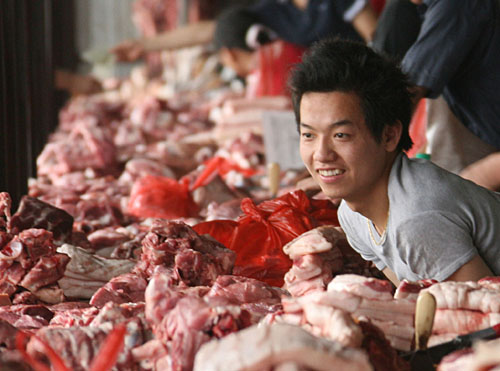 6月13日,商販在北京一家市場出售豬肉。當日,北京市統計局、國家統計局北京調查總隊聯合對外發布消息,5月份,北京市場豬肉價格同比上漲30.5%,鮮蛋價格同比上漲28%,帶動食品類價格上漲4.1%,由此拉動當月居民消費價格總指數上升1.2個百分點。