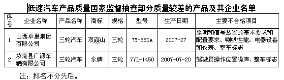 日前,國家質檢總局對低速汽車產品質量進行了國家監督抽查,共抽查了河北、山西、江蘇、浙江、江西、福建、山東、河南、四川、安徽、廣西等11個省、自治區28家企業生產的28種產品(不涉及出口產品),產品實物質量合格率為92.9%。 依據相關的國家強制性標準及推薦性標準,此次抽查對低速汽車的行車制動性能(滿載)、駐車制動性能、燃料系統及排氣管、安全防護要求、自卸裝置、轉向及限位裝置、滿載最高車速、車輛外廓尺寸、車輛后懸、使用說明書等21個項目進行了檢驗。 抽查結果表明,連續多年的國家監督抽查促進了企業質量意識的提高,產品質量保持穩定;此外,市場占有率較高的大、中型企業的產品質量較好。 抽查中發現的主要質量問題是整車標志、圖形和文字標志不符合標準規定。國家強制性標準規定,低速汽車產品標牌內容應規范齊全,車輛識別代碼、發動機編號打刻位置應在說明書中指明,三輪汽車的變速桿、手柄和開關等操縱機構應有耐久性標志明確標明其功能等。抽查中有個別產品標牌內容不全,車輛識別代碼、發動機編號位置與說明書指明位置不符,燈具開關無圖形和文字標志等。