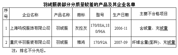 日前國家質檢總局對全國八個省、直轄市的50家羽絨服裝企業生產的50種產品(不涉及出口產品)進行質量抽查,產品實物質量抽樣合格率為99.1%。這八個省、直轄市為:北京、天津、上海、重慶、江蘇、浙江、江西、湖北、河北。 此次抽查對羽絨服裝產品的纖維含量、面料成分、里料成分、甲醛含量、pH值、耐水色牢度、耐洗色牢度、耐干摩擦色牢度、羽絨含絨量、蓬松度、耗氧量、清潔度、氣味等級、嗜溫性需氧菌、糞鏈球菌、亞硫酸還原的梭狀芽孢桿菌、沙門氏菌、充絨量、可分解芳香胺染料以及產品標識等20個項目進行了檢驗。 抽查中發現的主要質量問題: 1、