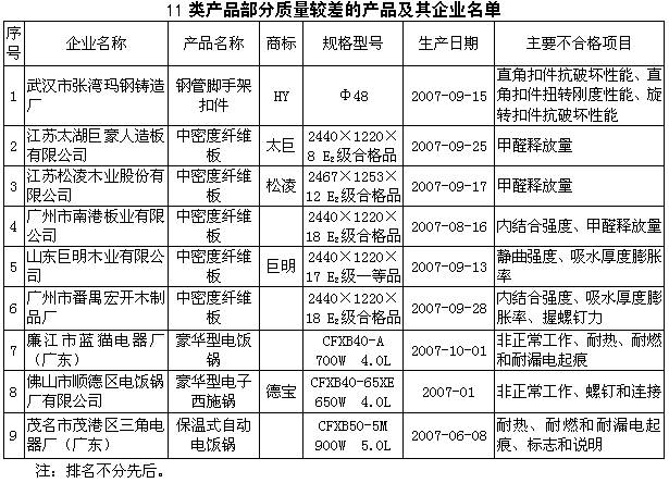 國家質檢總局近日組織對預應力混凝土用鋼絞線、鋼管腳手架扣件、電線電纜、中密度纖維板、家用燃氣灶、室內加熱器、電磁爐、自動電飯鍋、電熱水壺、汽車用制動器襯片、塑料外殼式斷路器等11類產品質量進行了國家監督專項抽查,共抽查了460家企業生產的475種產品(不涉及出口產品),產品實物質量抽樣合格率為96.5%。 此次抽查主要對電器產品的安全項目以及產品的主要性能指標、中密度纖維板的甲醛釋放量等項目進行了檢驗。經檢驗,11類產品實物質量抽樣合格率平均比上次提高了12.6個百分點。有36種獲國家免檢產品和10種中國名牌產品,產品實物質量抽樣合格率為100%。 預應力混凝土用鋼絞線產品的被抽查企業均獲得了生產許可證,產量約占全國總產量的80%。在近三次的國家監督抽查中實物質量抽樣合格率均為100%。 鋼管腳手架扣件產品實物質量抽樣合格率為97.2%,與上次相比抽樣合格率提高了27.2個百分點。抽查中存在的質量問題,主要是材質未達到可鍛鑄鐵KTH330-08牌號的要求;產品力學性能未達到標準規定要求等。 電線電纜產品俗稱塑料電線,此次產品實物質量抽樣合格率為98.3%。 中密度纖維板產品實物質量抽樣合格率為87.3%,大型生產企業產品實物質量抽樣合格率為100%。經檢驗,中密度纖維板產品的含水率和密度偏差兩項指標在連續三次的國家監督抽查中,單項符合率均為100%,靜曲強度、彈性模量等指標單項符合率穩步提高。但抽查中也存在一些質量問題,主要是甲醛釋放量、吸水厚度膨脹率、內結合強度項目不合格。 家用燃氣灶產品從2000年以來已連續抽查了七次,此次產品實物質量抽樣合格率為96.8%,與上次相比抽樣合格率提高了21.8個百分點,檢驗的安全指標項目中有九項重要指標單項符合率達到了100%。 室內加熱器產品質量逐年提高,此次產品實物質量抽樣合格率為99.9%,與上次相比抽樣合格率提高了14.9個百分點。歷次抽查質量問題較多的對觸及帶電部件的防護、工作溫度下泄漏電流和電氣強度、結構、外部導線用接線端子等安全項目在此次專項抽查中單項符合率均達到100%。 電磁灶產品實物質量抽樣合格率為98.9%。有五種獲國家免檢產品整體質量較好,產品實物質量抽樣合格率為100%。檢驗的安全項目中有九項重要指標單項符合率達到了100%,其中輸入功率和電流、防水、絕緣電阻和電氣強度、接地措施、爬電距離、電氣間隙和穿通絕緣距離等指標在連續四次的國家監督抽查中全部達到國家強制性標準規定的要求。 自動電飯鍋產品實物質量抽樣合格率為90.3%。抽查中發現的質量問題,主要是非正常工作、耐熱、耐燃和耐漏電起痕項目不合格。 電熱水壺產品經歷了幾年的更新換代,現在的主流產品是具有溫控、防干燒、超溫保護等功能的無繩式結構的電熱水壺產品,從結構設計上有效地保護了產品的質量安全。此次抽查產品實物質量抽樣合格率為99.2%,與上次相比抽樣合格率提高了25.9個百分點。 汽車用制動器襯片產品實物質量合格率為98.9%。此次抽查汽車用制動器襯片產品中的磨損率、指定摩擦系數允許偏差項目有較大提高,磨損率項目單項符合率達100%。 塑料外殼式斷路器產品實物質量抽樣合格率為99.1%,與上次相比抽樣合格率提高了29.4個百分點。此次抽查中,塑料外殼式斷路器的額定極限短路分斷能力項目從2006年58.3%的單項符合率提高到此次的92.5%,提高了34.2個百分點。抽查結果表明,生產企業在技術能力和質量控制方面有了明顯提高,在抽查檢驗過程中外殼破碎、觸頭粘連等現象明顯減少。