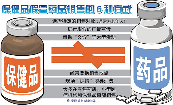 記者在采訪中了解到,保健品假冒藥品主要是通過在產品名稱、外包裝、功能和廣告宣傳上做文章,消費者需要小心辨別。 一是在產品名稱上做文章。1、從名稱上暗示對某種疾病有獨特的療效,如“耳貼靈”“骨質增生一貼靈”“腳癬一次凈”“菌必凈”等。2、名稱高度仿藥品,如“慢炎舒檸”“慢咽舒寧”(仿國藥準字“慢嚴舒檸”)、“甘草片”(仿復方甘草片)、“雙黃蓮口服液”(仿雙黃連口服液)、“666皮炎平”(仿999皮炎平)等。3、直接用藥品名稱來命名,如使用已有藥品名稱川貝枇杷膏、婦科千金膠囊等。 二是在外包裝上做文章。1、仿造藥品包裝的圖案、風格。2、標示有藥品特有的標志,如藥典中收錄的主要成分、OTC標志、外用藥標志等。3、在包裝、標簽、說明書上標示“藥”“純中藥”“藏藥”等字樣。 三是在生產企業名稱上做文章。多仿藥品生產企業名稱,且有的產品確為藥品生產企業生產的。常見的有醫藥生物公司、藥業公司、制藥公司、生物制品公司、保健品公司等。 四是在功能上做文章。1、在包裝標志及說明書中直接標示[功能主治][適應證][用法用量]。2、主要成分均為藥典收載品種,在說明書中對主要成分分別描述功能主治、適應證,以暗示整個產品的治療作用。3、超出保健功能暗示對各種疾病有治療作用,有的甚至對療效作出承諾,其宣稱的適應范圍不但超出保健范圍,甚至超過同類藥品的適應范圍。主要集中在有關各類皮膚疾病、婦科疾病、糖尿病、心腦血管病、痔瘡、燒燙傷、跌打損傷等方面的產品,有些還宣稱能治療消化不良、鼻炎、鼻竇炎等。
