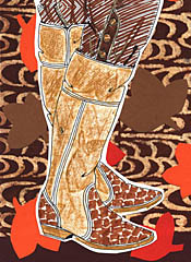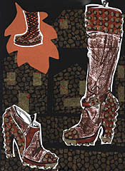 ROCKOCÒ品牌男鞋則使用奢華的18世紀裝飾,帶有一點諷刺的搖滾味道?臻g設計大多在腳踝以上,是18世紀的及踝休閑鞋以及牛仔靴樣式。用料以小牛皮為主,印有巴洛克式風格的設計圖案,浮雕式的灰泥效果以及壓紋蛇皮。 |