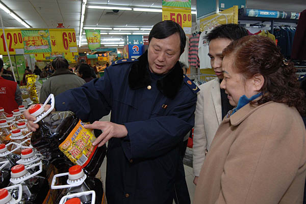 3月3日,重慶市工商局沙坪壩區分局的一名工商干部正在一個社區超市向消費者宣傳合格食用油的辨別方法和購買到偽劣食品的維權知識。