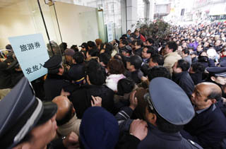 3月1日,杭州旅游消費券在上海啟動派發當天,作為派發點之一的九江路杭州銀行上海分行排起了長龍。原定下午2時開始的派發活動吸引了不少市民。臨近中午,主辦方看到排隊市民已達千人,而且人數還在增加,擔心出“狀況”,決定把派發消費券的時間提前到下午1時。 到下午2時,人員仍源源不斷涌來,杭州旅游消費券卻將派發完畢。當工作人員提醒申領者不必再排隊等候時,部分激動群眾強行沖擊側門,哄搶旅游消費券。原本秩序井然的隊伍頓時亂成一團,圍欄被推倒,有人被擠倒在地,手腳受傷。警方拉起警戒線后,主辦方于2時30宣布停止派發活動。一小時后重新向等候在銀行門口的群眾派發旅游消費券,半個小時內發放完畢。 此前,江蘇常州在上海派發消費券時也發生了類似狀況。 然而,南京發放旅游消費券卻遭冷遇。不少獲得旅游消費券的市民不顧其不準買賣的規定,將100元價值的旅游消費券在網上以50元甚至更低價格轉讓。 旅游消費券發放,為何遭遇“冷”“熱”兩重天?對此,網民各抒己見。網友KA抱怨說,旅游券發放不夠“實惠”,噱頭大于實際意義!半m然旅游券可以每40元抵用10元,但出門旅行各項花費遠遠超過所得到的實惠”!奥糜蜗M券其實刺激不了消費,原因很簡單:在乎消費券那點小便宜的人沒什么消費能力,真正有消費能力的人不會去湊那個熱鬧!本W友euro2k認為,消費券沒發到合適的人手中,結果是白費勁。