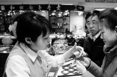 1月30日,北京工美大廈玉石商場的一位營業員向購買玉器的顧客介紹玉石。方云偉