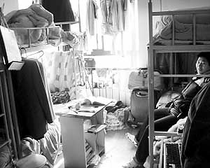 筆者自稱是準備求職的學生,來到位于中潭路中遠兩灣城的“易安居”求職公寓。筆者發現,這個樓盤入住率低,一樓大廳沒有保安,也沒有安裝對講機和防盜門,可以自由出入。一名工作人員帶筆者參觀位于20樓的一處“雙人房”,約十平方米的小房間里只有兩個床墊、兩個小柜子和一臺小電視機。工作人員介紹,這間房每月租金700元錢。 隨后,工作人員又帶筆者到22樓看一間更便宜的房間,三室一廳的套房共有10張雙人床,每張床上都堆滿被子和雜物。房間是水泥地面,廁所里簡單裝了個淋浴頭,客廳里晾著兩排衣服。這里的床位每月360元,按天數算,則是15元一天。 兩套“求職公寓”里都沒懸掛營業執照等證件。筆者問及經營資質,工作人員立即回答:“這和入住沒關系,你沒必要知道!睋,這家求職公寓有自己的網站,此外還在一些學生網上發帖子和做廣告。整個暗訪過程中,工作人員沒有要求筆者出示學生證。 事后,筆者登錄“易安居”求職公寓網站,網頁上的“學生公寓實景圖”和實際情況大相徑庭。而筆者在一些房屋中介處了解到,同一地段15平方米左右的單間月租費為700元左右,價格不高于“求職公寓”。