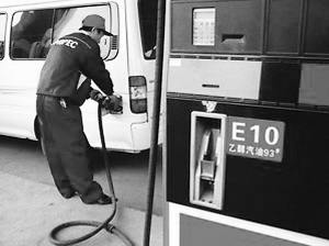 中石化武漢常碼頭加油站的員工正在給汽車加乙醇汽油。
