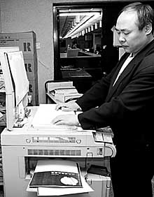 4月15日,國家圖書館第一復制室工作人員在為讀者復印圖書資料。自3月下旬以來,國家圖書館全面調整復印費,其中,A4紙由每張0.5元下調到0.3元,B4紙由每張0.6元下調到0.4元。本報記者