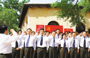 。翟拢踩,在河北省平山縣西柏坡,一批新黨員在黨的七屆二中全會舊址前進行入黨宣誓!拔逡弧秉S金周期間,西柏坡迎來旅游高峰,每天接待游客約6000人次。劉 昀攝(新華社發)