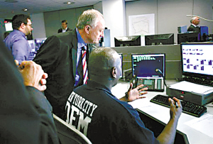 14日,倫敦市長肯·利文斯通(右二)在參觀紐約的應急事故處理系統。