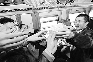 | 佟麗華在火車上給農民工發放法律援助卡,受到歡迎。何俊昌
