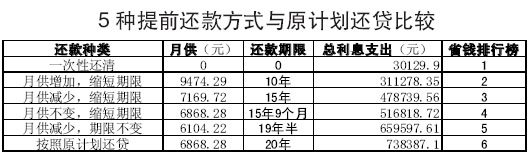第五種,部分提前還款,增加月供,縮短還款期限。 提前還款10萬元,月供增加為9474.29元,還款期限縮短為10年,提前還款后總利息為311278.35元。 利息總額=30129.9+281148.45=311278.35元 業內人士分析指出,縮短貸款期限是節省利息的關鍵因素。從上述計算結果來看,還款期限15年與10年相比總利息支出相差近16萬多元。而還款期限20年與10年相比更是多支付了高達42萬多元的利息,這筆費用對于一個工薪家庭來講還是相當可觀的。因此房貸消費者一定要重視較長的還貸年限所帶來的高額利息支出,根據自身經濟情況盡量縮短還款年限,從而減少利息支出。 |