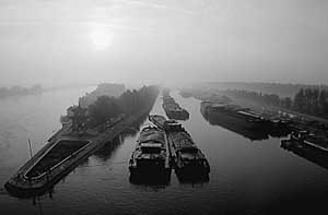 | 9月7日晨,中國大運河山東棗莊臺兒莊段。薄薄的水氣和炊煙上升形成飄逸的水霧,清晨的陽光灑在平靜的水面上,航道、航燈、船閘、船舶遠近相隔,若隱若現,構成了一幅動人心弦的“運河晨云霧曲圖”。臺兒莊段運河的“九月晨曲,十月晚霞”之景素享盛名。高啟民