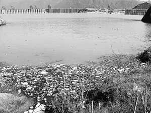 | 圖為湖北宜昌三峽大壩上游壩前庫區水面上漂浮的垃圾。劉君鳳