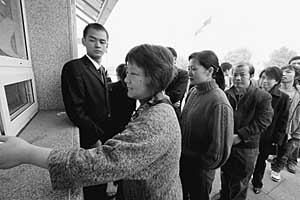 “上午3500,下午1500”,記者看到,在博物館門前發票處的窗口上,醒目地貼著每日參觀票的發放限額。當日下午兩點半左右,博物館“下半場”開始,參觀者排著整齊的隊伍有序進場,當門前還有三四十人時,發票暫停。保安解釋說:“3點鐘再發,控制一下人數!迸抨牭娜藗兌夹钠綒夂偷氐戎,或翻看報紙,或三五成群地聊天。
