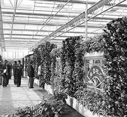 深秋時節,驅車來到上海都市菜園。行前想象,既為菜園,不外乎廣闊的田地,連棟的大棚,里面長著一畦畦一壟壟的青菜?蓪嵕板娜徊煌阂婚g高大、寬敞的溫室暖房里,奇形怪狀的瓜果菜蔬不可勝數。這里的一根絲瓜,竟有1.8米長;南瓜一個重達150公斤;一株番茄展開枝葉,可以覆蓋60平方米,掛果1萬枚以上。還有墻面上立體栽培出的紅葉甜菜,營養液膜水中培育出的各類果蔬,五顏六色,美不勝收……