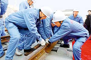 一般來說,23攝氏度是鋼軌鎖定的最佳溫度,可是工程恰好趕在了寒冬!皻鉁氐蛯ξ覀冧撥夋i定技術提出了非常大的挑戰,”中鐵二局股份公司副總經理、京津城際項目部經理王云波說,“我們人為把1500米的鋼軌拉伸了七八十厘米,再扣緊鎖定,由此保證了鋼軌一年四季的安全性。這在全世界都是絕無僅有的!