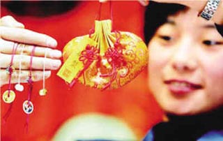 黃金賀歲產品爭相上市 金瓜子、十二生肖彩色金銀條、生肖金錢、節慶賀歲荷包……春節將至,北京市場各種黃金賀歲禮品爭相面市,受到消費者追捧。1月24日,菜百柜臺上的“節慶賀歲荷包”一個小時就賣出30余個。吳名