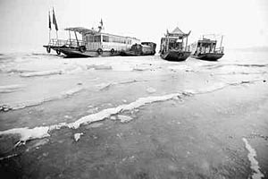 但從1月31日起,向陽碼頭至蓮花碼頭幾公里寬的水域全面出現冰封,所有輪渡以及20多艘快艇都結結實實凍在冰里,水上交通因此中斷。