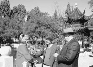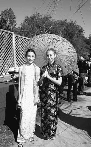 | 身著中式服裝的當地少女在園中留影。管克江/攝 | 本報洛杉磯2月24日電 23日,美國加利福尼亞州久負盛名的亨廷頓圖書館內流芳溢彩,紅燈高懸。隨著鑼鼓聲動,祥獅起舞,加州第一座、也是目前美國最大的中國古典式園林“流芳園”正式開門迎客。