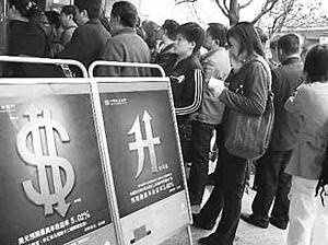 圖為北京一家銀行營業部,顧客在排隊購買外匯理財產品。 | 正在銷售的外匯理財產品