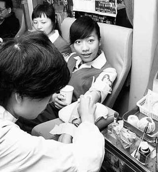 | 圖為4月11日,一名女孩在福州東街口獻血車上獻血。鄭帥