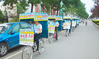 | 8月31日,濟南“萬人購房團”發起人在泉城路開展廣告宣傳活動。本報記者