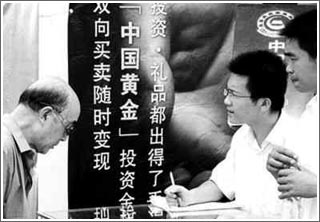 一年開設47家分公司,這是寶鑫金業創造的布點速度。 成立于2006年9月的寶鑫金業,是一家注冊資本500萬元,經營范圍涵蓋黃金、鉑金飾品的加工、銷售,珠寶、玉器的銷售以及黃金交易代理及咨詢服務的新企業。 這樣一家名不見經傳的公司,為何能快速布點并誘導大量投資者“上鉤”呢?記者調查發現,這主要是因為寶鑫金業惡意利用了三大“誘餌”: 誘餌一——企業品牌!案]x”品牌創建于1984年。公司下設六家專業首飾生產加工基地和一個檢測中心,已形成集團化、專業化的珠寶首飾加工、出口、內銷的經營網絡,是國內首家在港上市的珠寶企業,也是上海黃金交易所綜合類會員單位。為取得投資者的信任,寶鑫金業在“客戶協議書”中大肆宣傳所謂的“福輝標準金延期交收業務”,給人此項業務與福輝公司密切相關的誤導。對此,福輝公司強調,公司并無此項業務。 誘餌二——公司授權。為使投資者深信不疑,寶鑫金業特別將福輝公司的“授權書”放在“客戶協議書”的突出位置!笆跈鄷狈Q:“茲授予福建省寶鑫金業有限公司代理福建省福輝珠寶有限公司開展上海黃金交易所黃金延期交收及咨詢業務。時間為2007年3月1日至2008年2月28日!蓖顿Y者也因此打消了顧慮。 誘餌三——辦公場所。為了制造“福輝和寶鑫是合作伙伴”的假象,寶鑫金業還租下了福輝珠寶城四樓A區的辦公場地,設立了“寶鑫黃金交易中心”,從事所謂“福輝標準金延時交收業務”的交收及咨詢業務。許多投資者正是到現場參觀后,才充分相信寶鑫公司,并大膽參與此項投資。