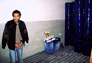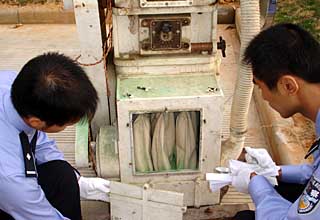 中國警方在制毒窩點從制毒機械中仔細取樣 |