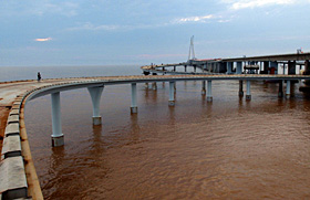寧波港是我國國際集裝箱運輸的干線港,又是上海國際航運中心的重要一員。根據國家規劃,上海國際航運中心由洋山港與長江沿岸港口和寧波港三者組成,功能互補,是上海國際航運中心的“中心兩翼”。然而由于杭州灣的阻隔,寧波港與上海港、太倉港交通不便,不利于三港優勢疊加和功能互補。 大橋建成后,杭州灣南岸的寧波、紹興和臺州等地到上海港、洋山港的距離均有不同程度縮短。寧波市港口局副局長孫時光表示,杭州灣跨海大橋的貫通,對寧波港口來講,既是機遇也是挑戰。孫時光認為,從長遠看,寧波港和上海港優勢互補各呈所長,F寧波港有80多條國際航線,上海港有120多條國際航線。杭州灣大橋的貫通,環杭州灣及周邊地區的出口企業,也有了更多的國際航線和更便捷運輸路線的選擇余地。 據介紹,以往溫州、臺州一帶到上海的貨物,基本通過杭州線路運達。杭州灣大橋建成后,每標箱經由杭州灣大橋要比走滬杭高速節省運費1500元左右。另一方面,蘇南和浙北地區的貨物流向也可能發生變化。杭州灣大橋建成后,蘇南到寧波北侖港的運輸距離也相應縮短了120公里,使這些地區的貨物進出口增加了一個與上海港相類似的口岸。 而與大上海隔海相望的寧波港與舟山港,通過杭州灣跨海大橋與上海的蘆潮港相通,再通過上海東海大橋與大小洋山港相連,串起了中國長江出?诮_B運“T”字型的黃金海岸。有數據顯示,2006年,上海港實現吞吐量4.7億噸、集裝箱2171萬標箱;寧波-舟山港總吞吐量4.2億噸、集裝箱712萬標箱。從港口吞吐量規模而言,上海港、寧波-舟山港已分別位居全球第一和第三的位置。據介紹,現舟山港-寧波港-杭州灣跨海大橋-蘆潮港-東海大橋-大小洋山港,已成為中國乃至世界上最大的港口群。而杭州灣跨海大橋則處在一線牽兩岸的關鍵環節。