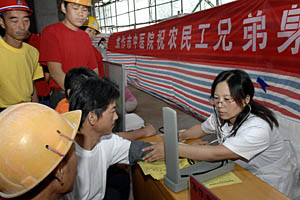 | 河南省焦作市醫護人員在為農民工檢查身體。本報記者 王頌