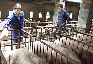 | 8月15日,安徽省淮北市烈山區古饒鎮一家養豬場的養殖戶正在給育肥豬喂食。為提高養殖戶的積極性,盡快保證生豬市場供應,國家財政從2007年起,實施能繁母豬補貼政策,按每頭50元的補貼標準,對飼養能繁母豬的養殖戶(場)給予補貼。本報資料照片 | 肉價飆升并未調動養殖熱情