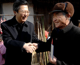 1月1日,75歲的老人何沛昌(左)由于身體不好,無法到村里領養老金,浙江省余姚市委書記王永康(右)步行來到何家,把養老金存折交到了何沛昌手中。新華社記者:王小川