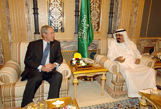 | 沙特國王阿卜杜拉(右)日前在利雅得與美國總統布什主要就加強雙邊關系和國際油價、伊朗核計劃等共同關心的熱點問題進行了探討。新華社/沙特通訊社 |