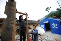 5月21日,隴南市武都區楓相鄉楓相塬村受災群眾在用從廢墟中揀出來的木頭搭建防震棚。 地震發生后,甘肅省隴南市武都區受災群眾在政府和社會各界的幫助下,積極展開生產自救,清掃廢墟,重建家園。新華社記者:聶建江