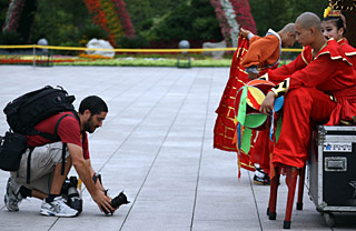 | 一名外國記者在天安門廣場采訪群眾文藝演出。新華社記者 高學余