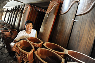| 江西省樟樹市中洲鄉車塘村農民付俊生正在檢驗古箏調音盒。2006年,他在上海打工學到技術后回家鄉辦起了古箏樂器作坊,年制作古箏上千架,銷往全國各地以及馬來西亞等國家和地區。新華社記者