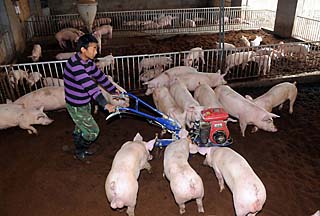 目前,相比今年3月份時的最高價,山東地區生豬和豬肉價格的降幅分別為34%和30%。山東省畜牧獸醫信息中心分布在全省25個價格信息點的統計數字顯示,到11月9日,山東地區待宰活豬價格為11.17元/公斤,環比上周又下降1.24%;豬肉價格為18.20元/公斤,環比下降0.93%。記者還了解到,目前,山東省肥城市等一些地方的活豬交易價格,已出現10元/公斤的低價。 山東畜牧部門統計顯示,2008年3至4月份,山東地區生豬價格就在上下震蕩中呈現下滑態勢,4月底往后,下滑越來越快:4月28日,山東地區活豬價格為16.86元/公斤,8月25日降到13.1元/公斤,到11月初降到11元/公斤左右。 記者了解發現,目前,山東地區大型養殖場和散戶都面臨虧本。 大型養殖場:山東省鄒平縣長山鎮養豬大戶李元(化名)給記者算了筆賬:目前,當地玉米價格約為1470元/噸,豆粕價格約為3500元/噸,豬料價格達2.3元/公斤。自繁自育100公斤肥豬,成本超過10.5元/公斤,目前生豬價格約為11元/公斤,已接近盈虧平衡點。李元目前存欄能繁母豬600頭,存欄仔豬及育肥豬5000余頭,壓欄仔豬2000余頭!吧i價格連續走低,養豬戶不敢購豬育肥了!彼麩o奈地說。 散戶:自繁自育剛剛保本,購買仔豬育肥每頭賠100元左右(100公斤)。山東省肥城市老城鎮毛小莊村村民王軍目前存欄母豬6頭,仔豬30頭。他說,當地購買一只豬仔要花400元左右,育肥飼料需要800元左右;再加上用藥費用、人工費用,成本合計超過12元/公斤。目前當地活豬價格為11元/公斤,還沒扣除運費,每頭肥豬虧本超過100元!叭ツ赀@個時候,當地每頭肥豬售價2300多元,利潤能到400多元!蓖踯娬f。 王軍目前還不敢淘汰母豬,因為現在母豬價格僅8元/公斤左右,“賣了就把本都賠光了!钡,毛小莊村部分散戶已開始淘汰母豬打算退市了!翱催@架勢,生豬價格還得落,年底可能10元/公斤都沒人要了!蓖踯姄牡卣f。