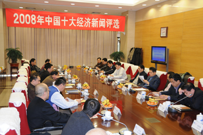 | 2008年中國十大經濟新聞評選現場 | 本報訊 由經濟參考報和天津北方五金機電城有限公司聯合主辦,首都16家新聞單位總編輯、副總編輯與國內知名經濟學家評選的2008年中國十大經濟新聞,30日在北京揭曉。 當選的十大經濟新聞(按新聞發生時間順序排列)是: