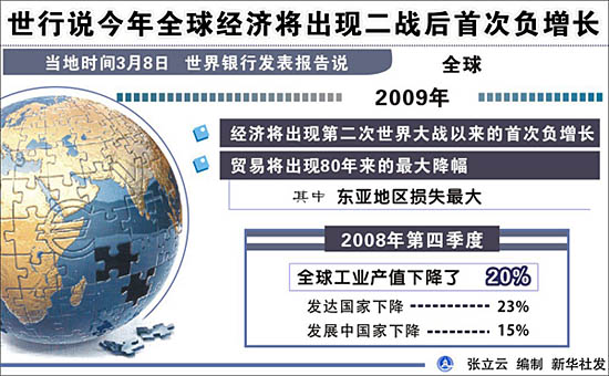 美國時間3月8日(北京時間3月9日),世界銀行發布報告稱,2009年全球經濟將出現二戰后首次負增長,全球貿易將創出80年來的最大降幅,發展中國家也將面臨2700到7000億美元的融資缺口。為此,世行敦促20國集團向發展中國家提供幫助以滿足其外部融資需求。 周六(3月14日),20國集團財長和央行行長會議將在英國倫敦召開。在為此次會議準備的一份名為《逆流而上:發展中國家如何應對全球危機》的報告中,世界銀行作出了上述判斷。