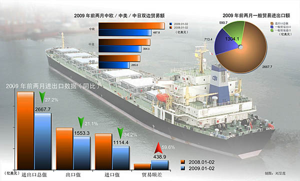 海關總署11日公布的數據顯示,我國2月份進出口數據雙雙下降。專家認為,這一組數據符合市場預期,未來出口下降可能還會加快,今年我國外需面臨較大壓力。 據海關總署發布的數據,2月份,我國外貿進出口總值為1249.48億美元,比去年同期下降24.9%。其中出口648.95億美元,下降25.7%;進口600.54億美元,下降24.1%;貿易順差48.41億美元。這是中國外貿連續四個月出現負增長,而且較1月份近400億美元貿易順差,2月份的貿易順差更是下降了9成。而部分勞動密集型產品出口相對跌幅較小。 “這次全球經濟衰退比1998年亞洲金融危機時嚴重得多,很難說哪個國家可以一枝獨秀。今年中國面臨的外需尤其是出口壓力將會很大。一方面,全球經濟衰退導致需求大幅度萎縮;另一方面,當前全球信用緊縮導致部分海外具有剛性需求的訂單得不到貿易融資的支持,也影響了我國的出口!敝袊y行國際金融研究所高級分析師溫彬認為,自去年11月份以來,我國進口和出口連續4個月同比負增長,由于進口下降幅度大于出口降幅,我國繼續保持貿易順差狀態。但較去年相比,預計今年貿易順差將有較大下降。 中投證券宏觀分析師邢薇薇認為,2月份出口和進口的降幅都符合市場預期,未來出口下降可能還會加快,像日本的出口降幅達百分之三四十。而進口降幅可能在延續兩個月后會有所收斂,這主要受助于國內需求增加的拉動。 交通銀行發展研究部研究員劉能華說:“在美國經濟持續惡化、歐洲經濟深度陷入衰退、新興市場經濟體受危機的影響尚未完全釋放的情況下,出口還有進一步下探的空間;而進口將隨著國內刺激經濟措施的推進而企穩,國內經濟走向復蘇而有望進一步止跌回升。在進口與出口發展呈現反‘剪刀差’的發展趨勢下,貿易順差將進一步收窄,不排除二季度出現逆差的可能! 渣打銀行經濟學家李偉表示,從數據來看,金融危機使得出口市場仍然很疲弱。雖然進口數據有所好轉,但一部分是由于春節因素,1月份的進口積累到了2月份。他同時強調,進口產品中鐵礦石和銅的增長出現了反彈,但這不能說明內需有所反彈,有些進口或許是補充國內生產量的不足。另外,這兩種產品投機性較強,國內和國際市場出現了價格倒掛現象,因此有些進口可能是投機因素。