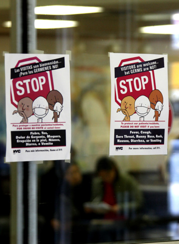 美國紐約皇后區的一家醫院玻璃門上貼著一則提醒人們有打噴嚏、咳嗽等癥狀時應該戴上口罩、使用紙巾或袖子進行遮擋的小告示。新華社記者:劉欣 攝