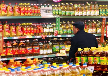 繼花生油漲價后,上海食用油市場的大豆油也啟動新一輪漲價。記者在一家大型賣場了解到,目前部分品牌的大豆油已完成調價,漲幅約10%,而其余品牌也計劃于近期將陸續上調零售價。圖為顧客在一家賣場內選購食用油。新華社記者