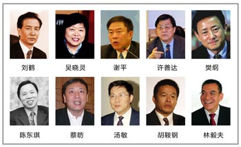 這10位經濟學家分別是:中央財經領導小組辦公室副主任劉鶴、中國人民銀行原副行長吳曉靈、中央匯金投資有限公司總經理謝平、國家稅務總局原副局長許善達、中國改革基金會國民經濟研究所所長樊綱、中國發展與改革委員會宏觀研究院副院長陳東琪、中國社會科學院人口與勞動研究所所長蔡昉、中國發展研究基金會副秘書長湯敏、清華大學公共管理學院教授胡鞍鋼以及北京大學原中國經濟中心主任、現任世界銀行副行長林毅夫。