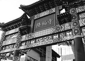 | 早先隆福寺廟會熱鬧的場景已難尋覓,而這個后建的牌樓卻讓人們記住了它。 | 隆福寺廟始建于明景泰一年(公元1452年),清雍正元年重修。隆福寺的廟會,已有二三百年的歷史。據《大清一統志》載:“隆福寺,逢每月之九、十有廟市,百貨駢闐,古玩字畫,風味小吃,花鳥魚蟲——,為諸市之冠!鼻寮螒c寫于二十二年的《草珠一串》載:“東西兩廟貨真全。一日能銷百萬錢,多少貴人閑至此,衣香猶帶御爐煙”。說明當時隆福寺廟會繁榮的光景。而真正的繁榮是在清末時期,即光緒二十七年(1901年),隆福寺廟宇毀于火。燒毀天王殿后,迄未重修。廟中喇嘛將地皮按塊租給攤商,收取地皮費,名為香錢。那時,廟會已改為逢每月一、二、九、十日開市。這個處在內城中心區,居民密集,最大的隆福寺廟會與西城護國寺廟會東西對應,被稱為東廟與西廟,形成城區兩大雜品市場。經營品種上至綢緞布匹,下至花鳥魚蟲,無所不有,當然小吃品種更是遍布廟會各個角落。但多數小吃攤商,還是集中在廟會西側,這里有殘存西配殿,一些賣茶湯、油炒面、豆汁、杏仁茶等流食的小座商在此還設有座位,桌上鋪有潔白桌布,門臉上懸掛白布簾,這在當時的廟會上,衛生條件算是一流的了?蓜e小看這些小座商、攤商、推車和擔擔者,其中不乏精工細致,饒有風味的品種。如扒糕、灌腸、炸丸子、羊霜腸、爆羊肚、驢打滾、吊爐燒餅、餛飩等等,以現在技術水平衡量,亦稱上乘。不少老北京市民特意到廟會吃上一盤豌豆黃、灌腸,以飽口福。 至今這里的小吃店還頗有名氣,保留著一些傳統品種,受到老北京人的歡迎。廟會上洋煙畫攤前也常常是擠滿了人,過去有搜集洋畫片的,和現在集郵相似,因此產生了交換洋煙畫的“自由市場”。隆福寺后門通錢糧胡同聚集著很多乞丐,等候逛廟的人給他們一些施舍。 新中國成立后,政府將各種攤販集中在廟前的大棚內,固定攤位,獨自經營。名曰“東四人民市場”,后改為國營百貨商場。上世紀80年代又把前面只有一層的營業大棚拆掉,換了一座高八層,設備先進的商業大廈,改名為“隆福大廈”。原隆福寺廟的建筑已蕩然無存。