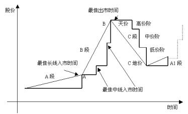 圖2-27A-B-C循環趨勢線 B趨勢線的橫坐標記錄了B段經歷的天數,縱坐標記錄了股價的變動,縱坐標與橫坐標之比記錄了股價上升的斜率。把經歷B段天數的日成交量累加可計算出換手率和總成交量。通過軟件的特別功能,可計算出持股人數變化比。 C趨勢線的橫坐標記錄了C段經歷的天數,縱坐標記錄了股價的變動,縱坐標與橫坐標之比記錄了股價下降的斜率。把經歷C段天數的日成交量累加可計算出換手率和總成交量。通過軟件可計算出持股人數變化比。 從入市風險來研究,A趨勢線的入市風險最小,B趨勢線次之,C趨勢線風險最大。 “風險入市法”規定,C趨勢線和B趨勢線的高價臺階是高風險時間段和高風險臺階,也是中長線投資者禁止入市的時間段和臺階。 A-B-C循環趨勢線能提供給投資者最佳的入市時間。入市的最佳時間是B趨勢線的起始點的前后幾個交易日;A-B-C循環趨勢線給出了最佳出市時間,出市的最佳時間是C趨勢線起始點前后幾個交易日。 如圖2-28所示,A-B-C循環趨勢線加上每一段的臺階式走勢可以告訴您當前股票在哪一段或哪一個臺階上運行的精確位置,并借助計算機的幫助,可以知道未來股市的準確走勢。 這種兩級劃分方法使股價走勢圖形更加清晰、清楚。絕大部分投資者所關心的是股市當天和未來的走勢。所以,對當前和未來的走勢要細分,而對過去的走勢可粗分。 圖2-28清楚地告訴投資者當前股票處在走勢中的準確位置,準確地告訴投資者最佳入市段、入市階、最佳出市段和出市階。 圖2-28A-B-C循環趨勢線和各段臺階式走勢示意圖 A-B-C循環趨勢線為計算機提供準確的數據取樣點和時間周期。通過對這個時間周期所定義的大量數據進行分析、整理、比較和計算,可以準確地了解到莊家和跟莊者的持股數量、操盤手法和A、B、C各段所發生的準確時間以及持續的長度,從而得到準確的入市時間和出市時間。