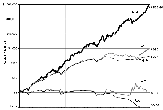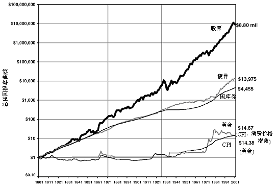 美國著名投資專家席格爾教授在他的著作《散戶投資正典(股史風云話投資)》一書中這樣寫到“如果1802年投資1美元在股票上,并保證將投資所得再投資于股票,那么到了2001年您的財富將累積至近8,800,000美元!彼种赋觥巴顿Y者在股票市場的收益大于投資長短期債券、國庫券、黃金!