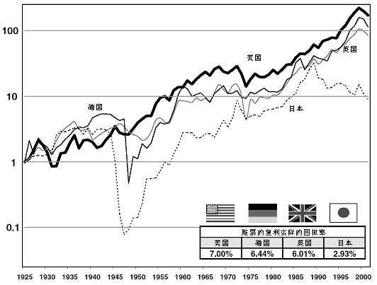 描述了美國、英國、德國和日本從1926年至今的股票實際總收益指數。很明顯,從1926到2001年的76年內,德國和英國股票的累積實際回報率走勢和美國很相近。這三個國家復利年均實際回報率的差距保持在1%之內。