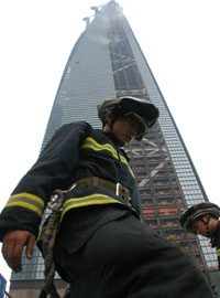 8月14日,消防員在發生火災的上海環球金融中心工地滅火搶險。